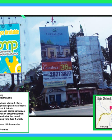 *Harga Hubungi CSJenis OOH : Baliho Vertikal Frontlite Lokasi : JI.Raya Sawangan- JI. Raya Muchtar Sawangan Depok(Pertigaan Parung Bingung) View : Dari Bogor/Parung/Pamulang menuju Limo/Cinere Ukuran : 6m x 4m x 1 muka Kondisi : Exiting Situasi : Padat lalu lintas JI. Alternatif Depok- Bogor, dekat kawasan wisata, kawasan bisnis, kawasan pertokoan, sekolah/pesantren, perumahan, dan pemukiman penduduk